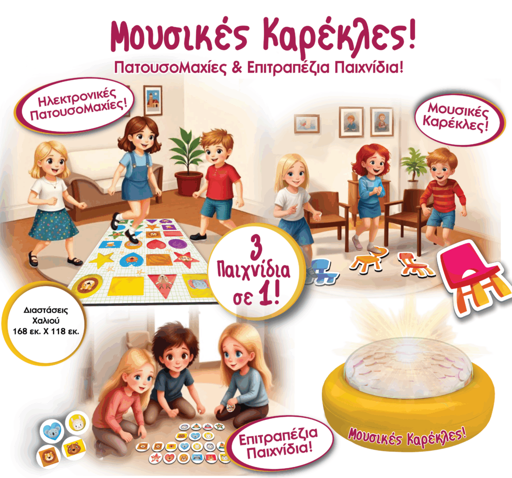 Περιλαμβάνει: μουσικό buzzer, χαλάκι (160 εκ Χ 120 εκ.), 10 χάρτινες καρέκλες, 100 καρτούλες-τάπες.